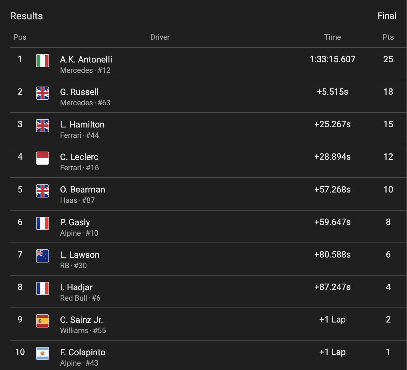 But getting to Complete Car is hard. Even when the game seems natural (which is get a working car that is reasonably fast), it turns out this goes bad very quickly. I'll paint a picture using the current 2026 standings of Formula One. Below are the results of the Chinese GP last weekend.